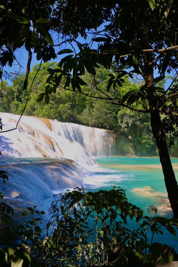 Agua Azul is easily one of the most stunning places I have ever visited. The water is an incredible aqua blue, and you can swim in it! Tours drive right to the waterfalls, and a path leads up the side of the falls. There are many access points to view the waterfalls and lots of calm swimming holes. Vendors sell fresh coconuts, fruit and empanadas. You can also buy bottled drinks and coffees, or have a sit down meal in one of the many restaurants. I visited Agua Azul, Cascada Misol Ha, and Palenque in one complete day tour.